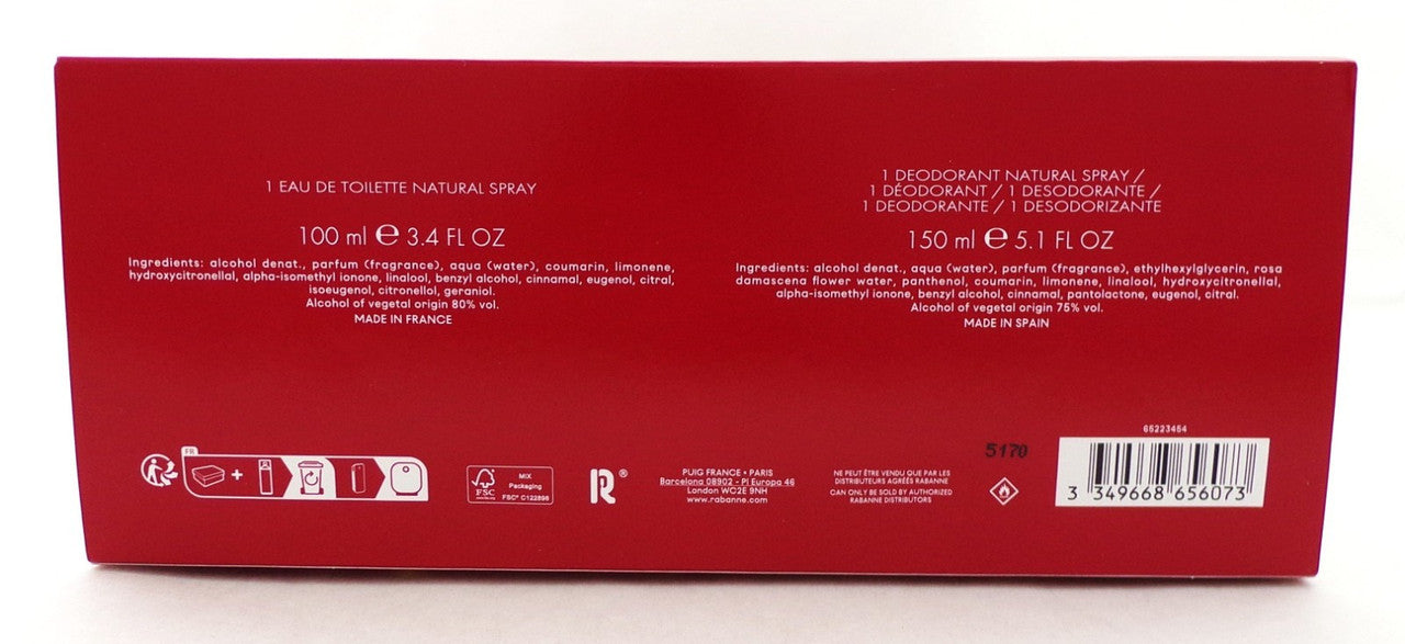 1 Million by Paco Rabanne 2 Pieces Gift Set for Men: 3.4 oz./ 100 ml. Eau de Toilette Spray + 5.1 oz./ 150 ml. Deodorant Spray.