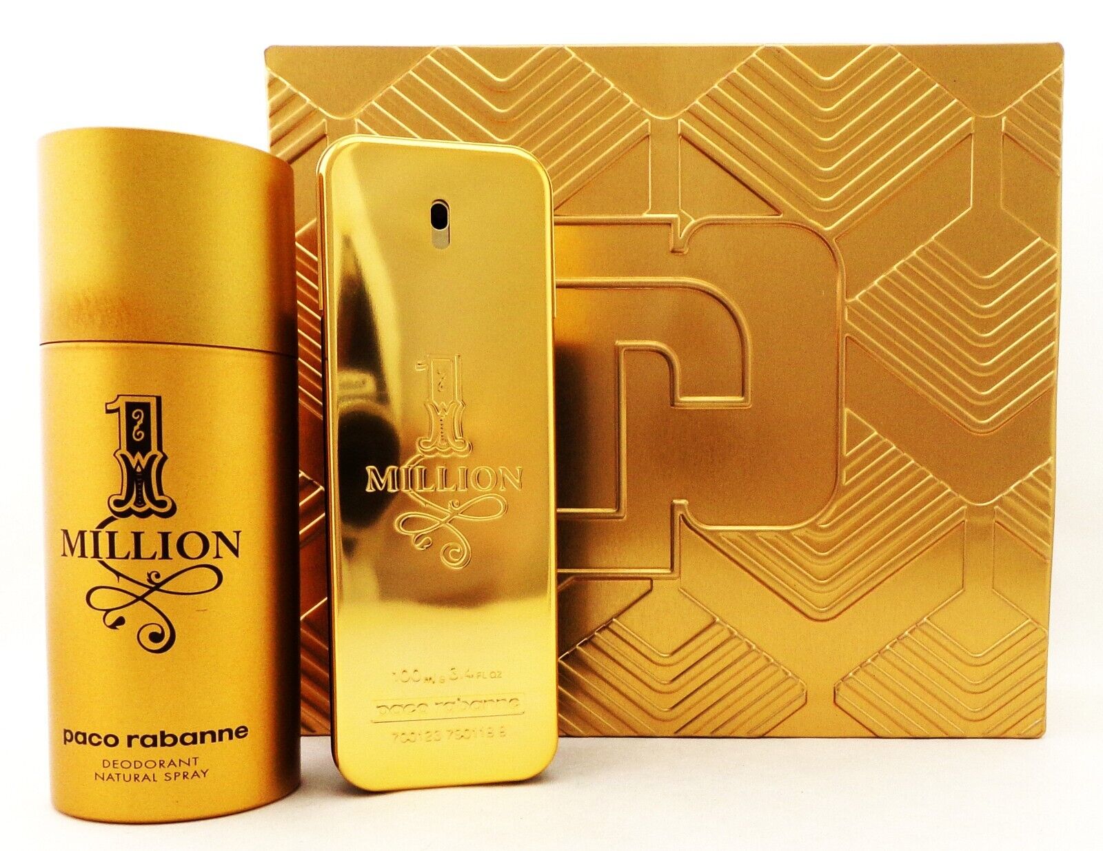 1 Million by Paco Rabanne 2 Pieces Set for Men: 3.4 oz./ 100 ml. Eau de Toilette Spray + 5.1 oz./ 150 ml. Deodorant Spray. Damaged Box. No cover. Brand new. Comes in retail tin box as shown on the picture. (our sku:15285)