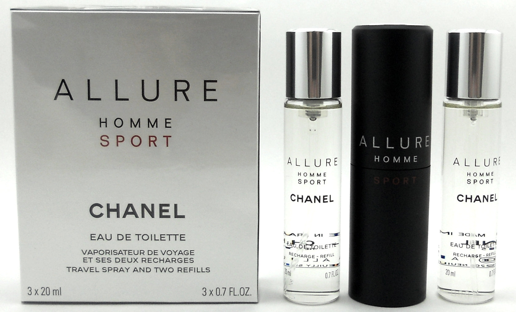 Allure Homme Sport Cologne Total of 2.0 fl. oz. One 20 ml. EDT Travel Spray with 2 Refills. Total 3 x.0.7 Oz /20 ml. Comes in Sealed Box.