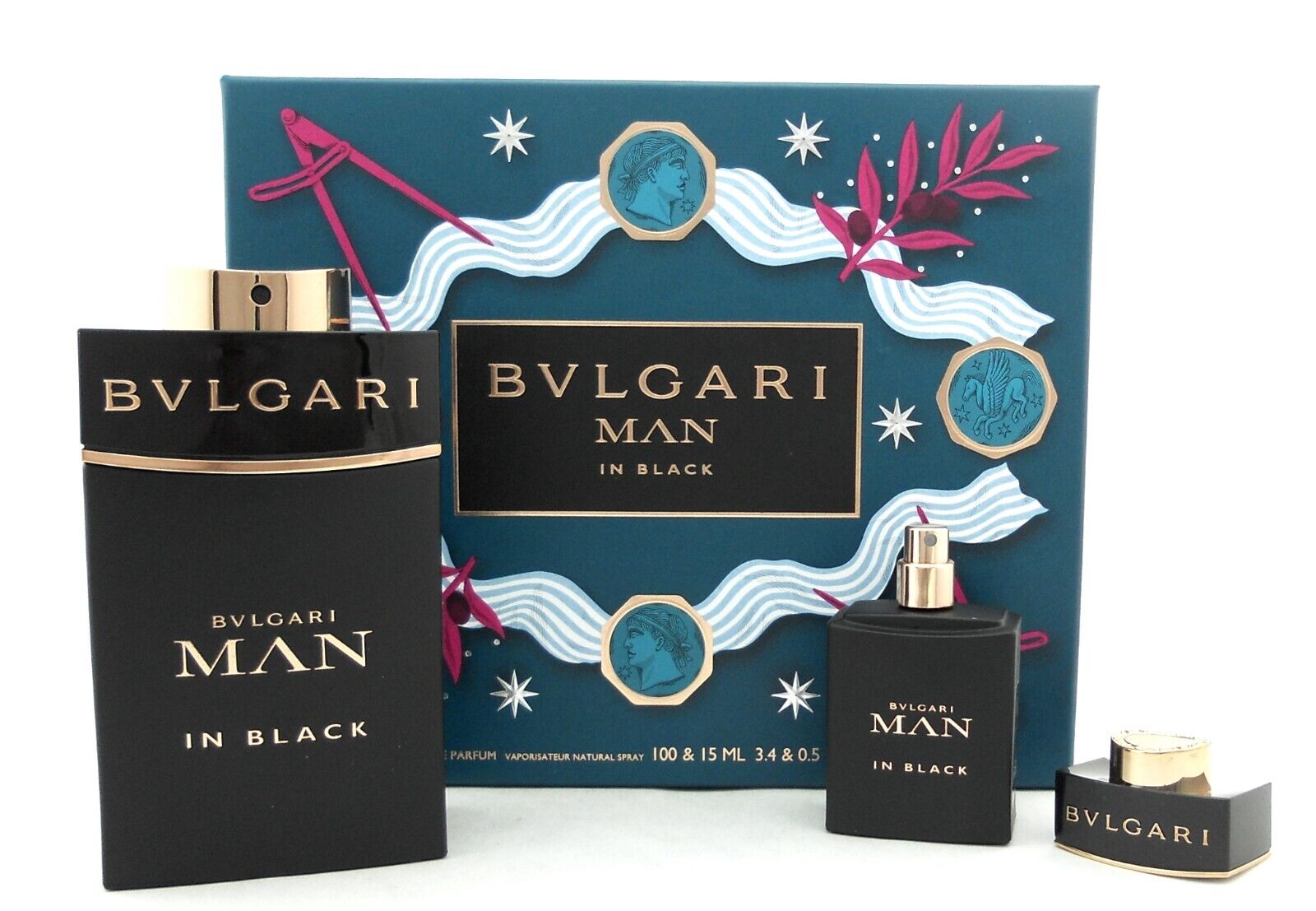 Bvlgari MAN in Black Gift Set for Men 3.4 oz./100 ml. EDP Spray + 0.5 oz./15 ml. EDP Spray. Brand New. Comes in Hard Box. (our sku:11954)