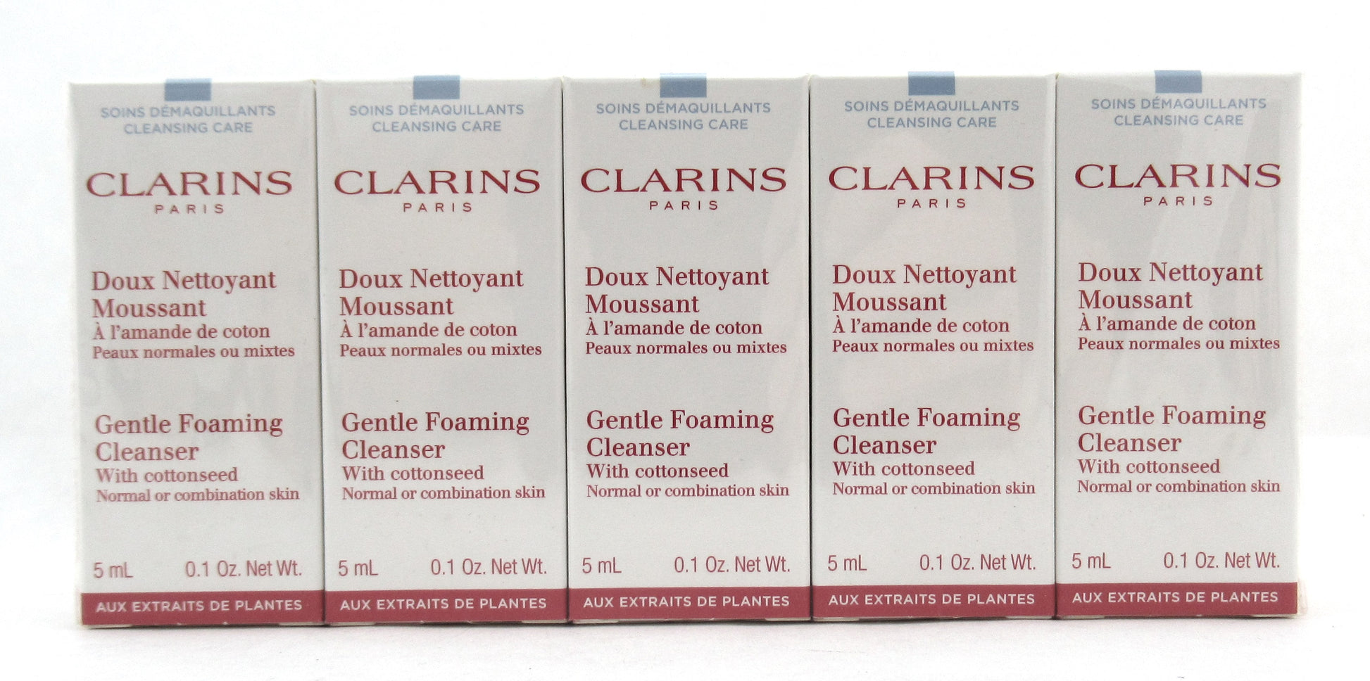 Clarins Gentle Foaming Cleanser with Cottonseed Normal or Combination Skin 5 ml./ 0.1 oz. Travel Size LOT of 10 New Brand new. Comes in lot of 10. Might be marked "sample/not for individual sale."
