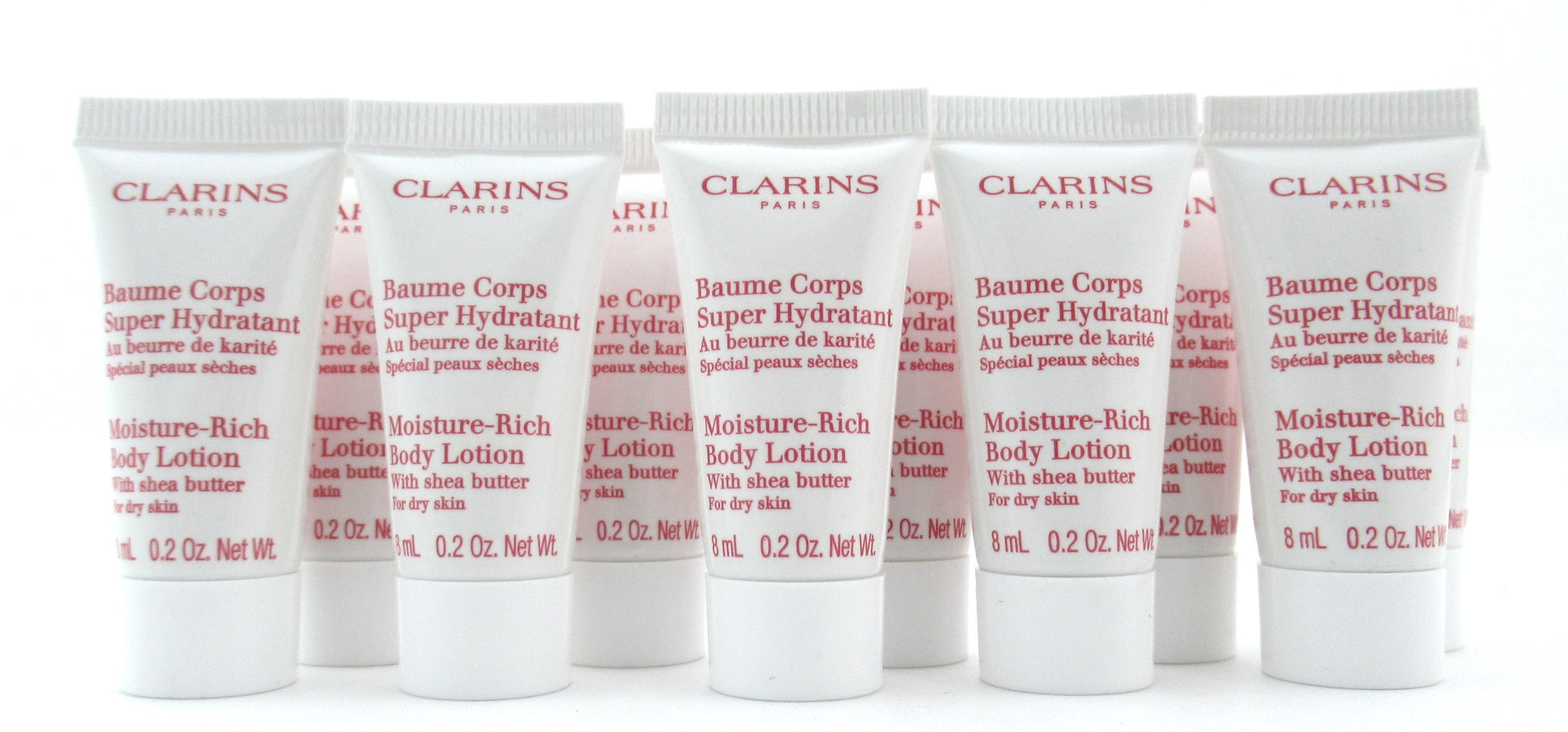 Clarins Moisture Rich Body Lotion with Shea Butter for Dry Skin Sample Size 8 ml./ 0.2 oz. Each Lot of 10 New Comes in lot of 10. Might me marked "sample/not for sale."