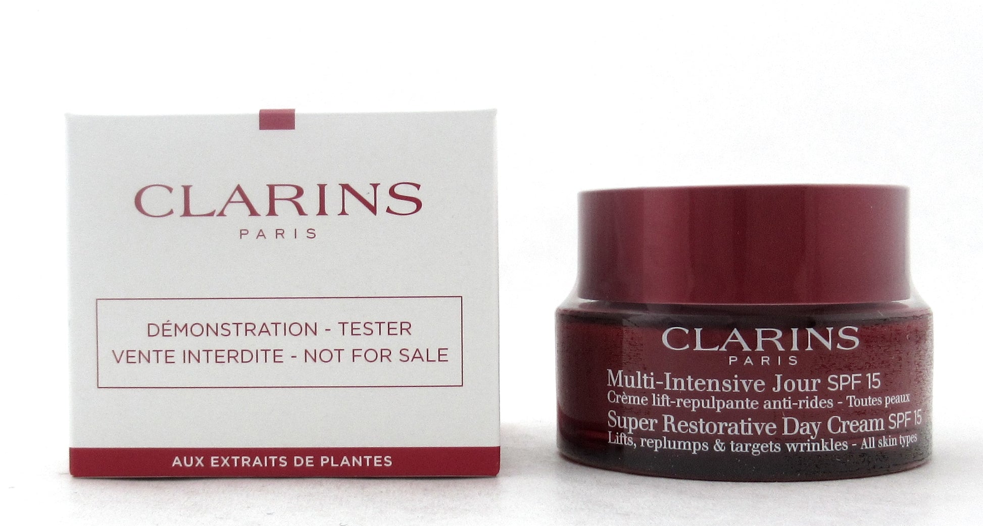 Clarins Multi Intensive Super Restorative Day Cream SPF 15 All Skin Types Lifts, Replumps & Targets Wrinkles 50 ml./ 1.7 oz. New Tester Brand new. Comes in non decorative tester box. May be marked "tester/demonstration/not for sale." Batch number may vary. (Our sku:3963)