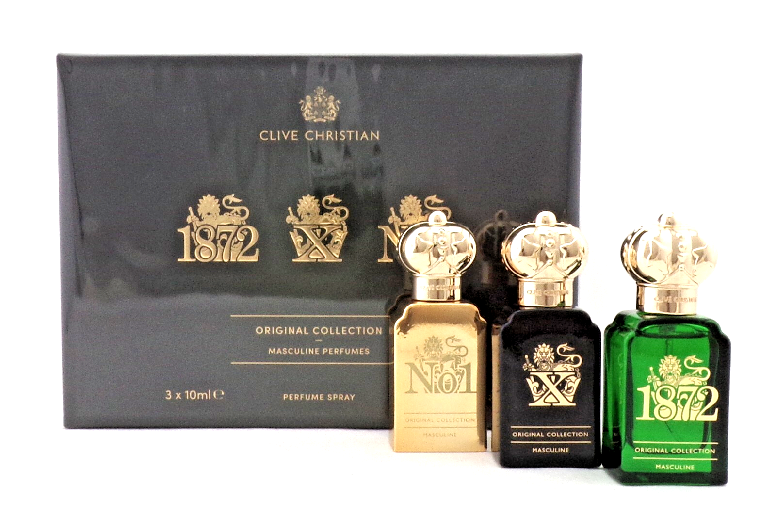 Clive Christian Original Collection Masculine Perfumes Gift Set: 1872 Masculine Perfume Spray 0.34 oz./ 10 ml + X Masculine Perfume Spray 0.34 oz./ 10 ml . + No.1 Perfume Spray 0.34 oz./10 ml. New set for Men. Comes in retail Sealed box. Batch number may vary. (our sku:23426)