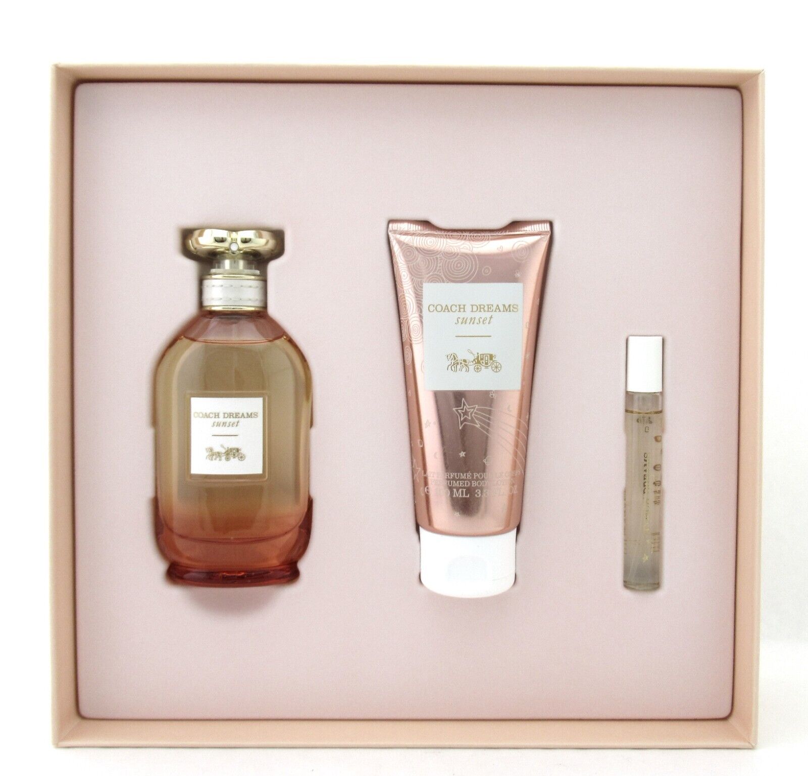 Coach Dreams Sunset 3 Pc Gift Set for Women Eau De Parfum Spray 90 ml./ 3 oz. + EDP Spray 7.5 ml./ 0.25 oz. + Perfumed Body Lotion 100 ml./ 3.3 oz. NewBrand new. Comes in hard retail box as shown on the picture. Batch number may vary. (Our sku:11122)