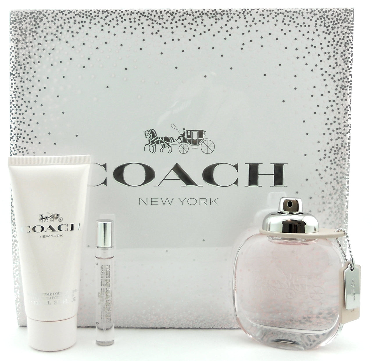 Coach New York 3.0 oz./ 90 ml.Eau de TOILETTE Spray + 3.3 oz./ 100 ml.Perfumed Body Lotion + 7.5 ml EDT Purse Spray. Brand new set. Comes in Hard Box.
