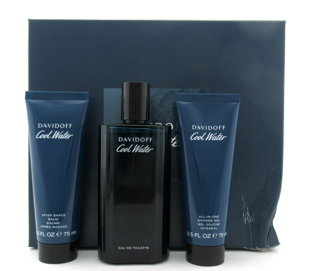 Cool Water by Davidoff 4.2 oz./ 125 ml. Eau de Toilette Spray + 2.5 oz./ 75 ml. All-In-One Shower Gel + 2.5 oz./ 75 ml. After Shave Balm Men's Set. Damaged Box