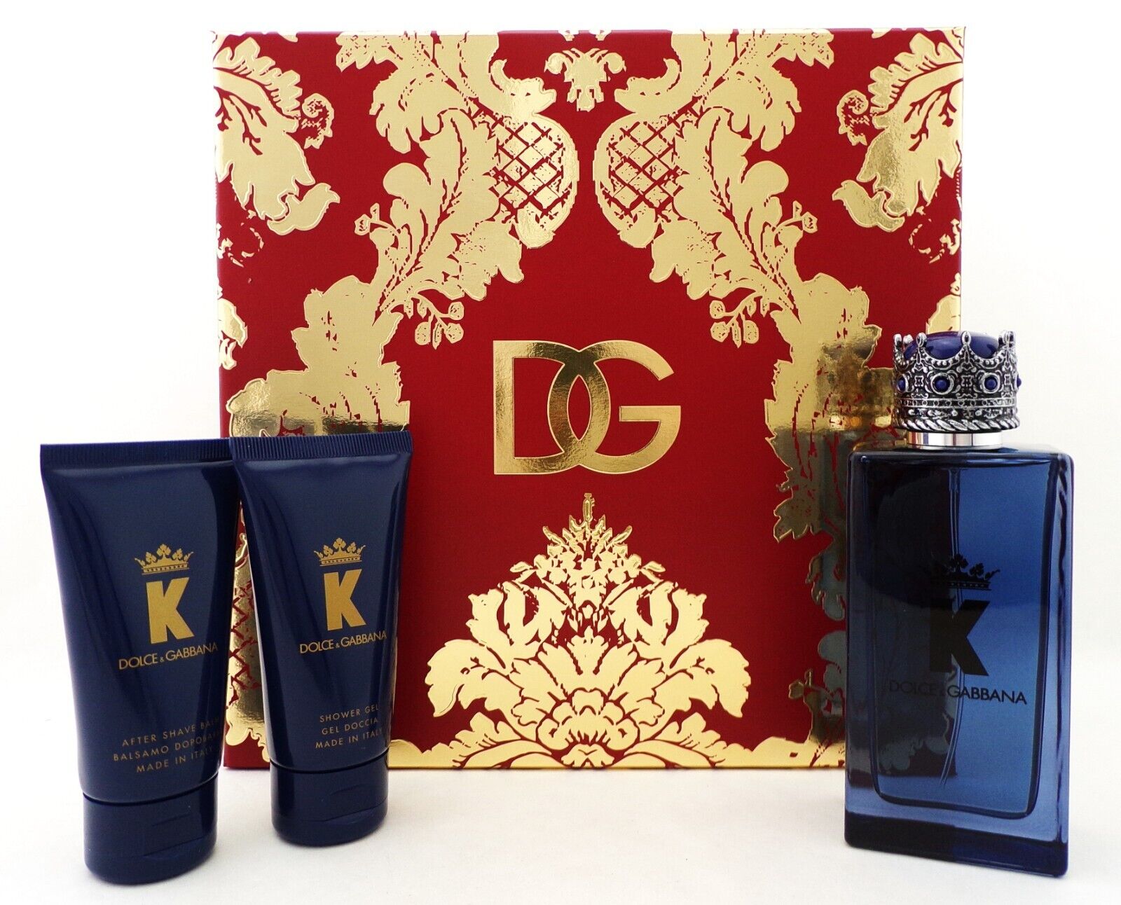 Dolce & Gabbana K for Men Set: Eau de Parfum Spray 100 ml./ 3.3 oz. + After Shave Balm 50 ml./ 1.7 oz. + Shower Gel 50 ml./1.7 oz. New Brand new. Comes in hard retail box. Batch number may vary. (our sku:14565)