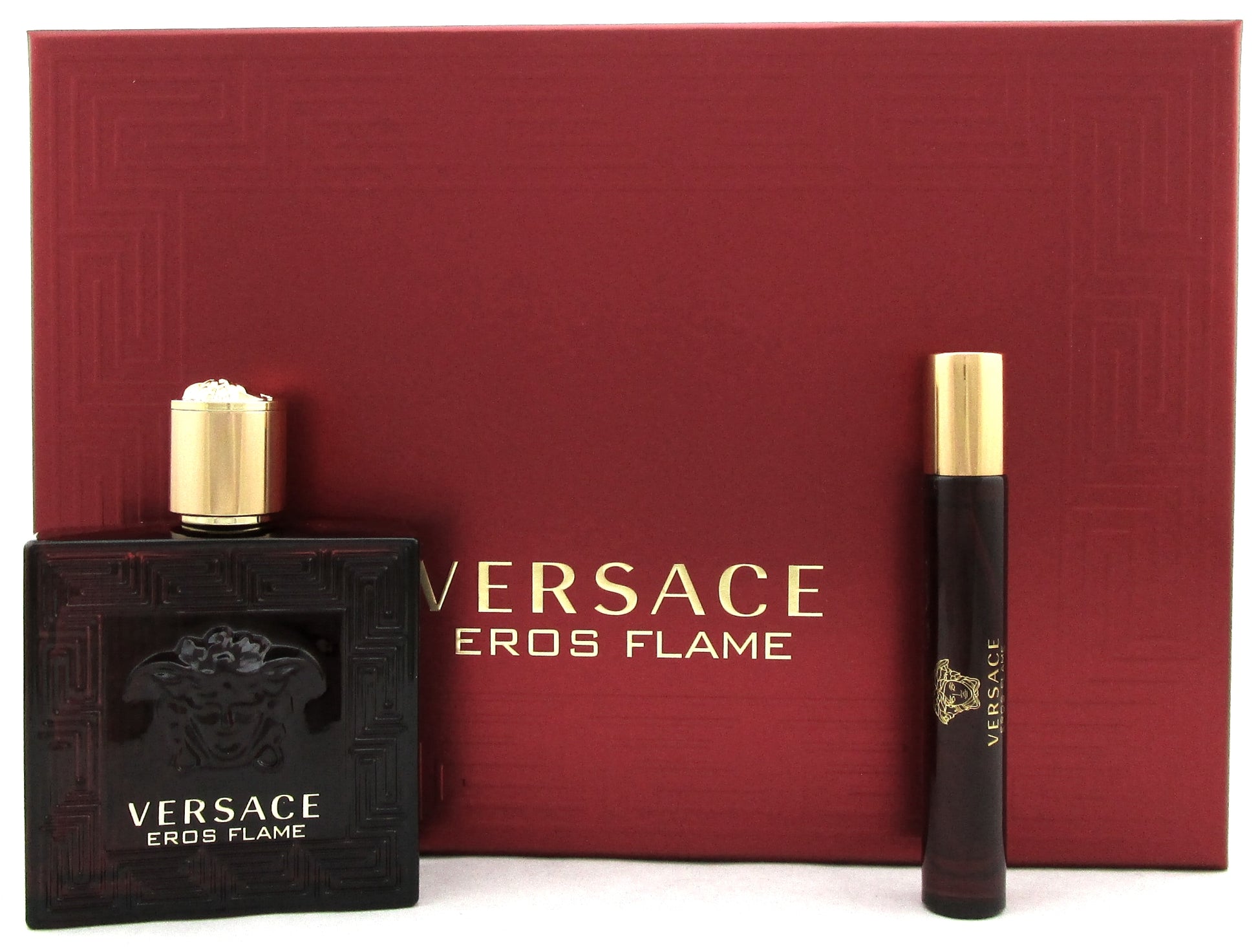 Eros Flame by Versace Gift Set for Men: 3.4 oz./ 100 ml. Eau de Parfum Spray + 0.3 oz./ 10 ml. Eau de Parfum Spray (travel spray) + Versace Trousse man (Bag). Brand new set. Comes in hard box as shown.