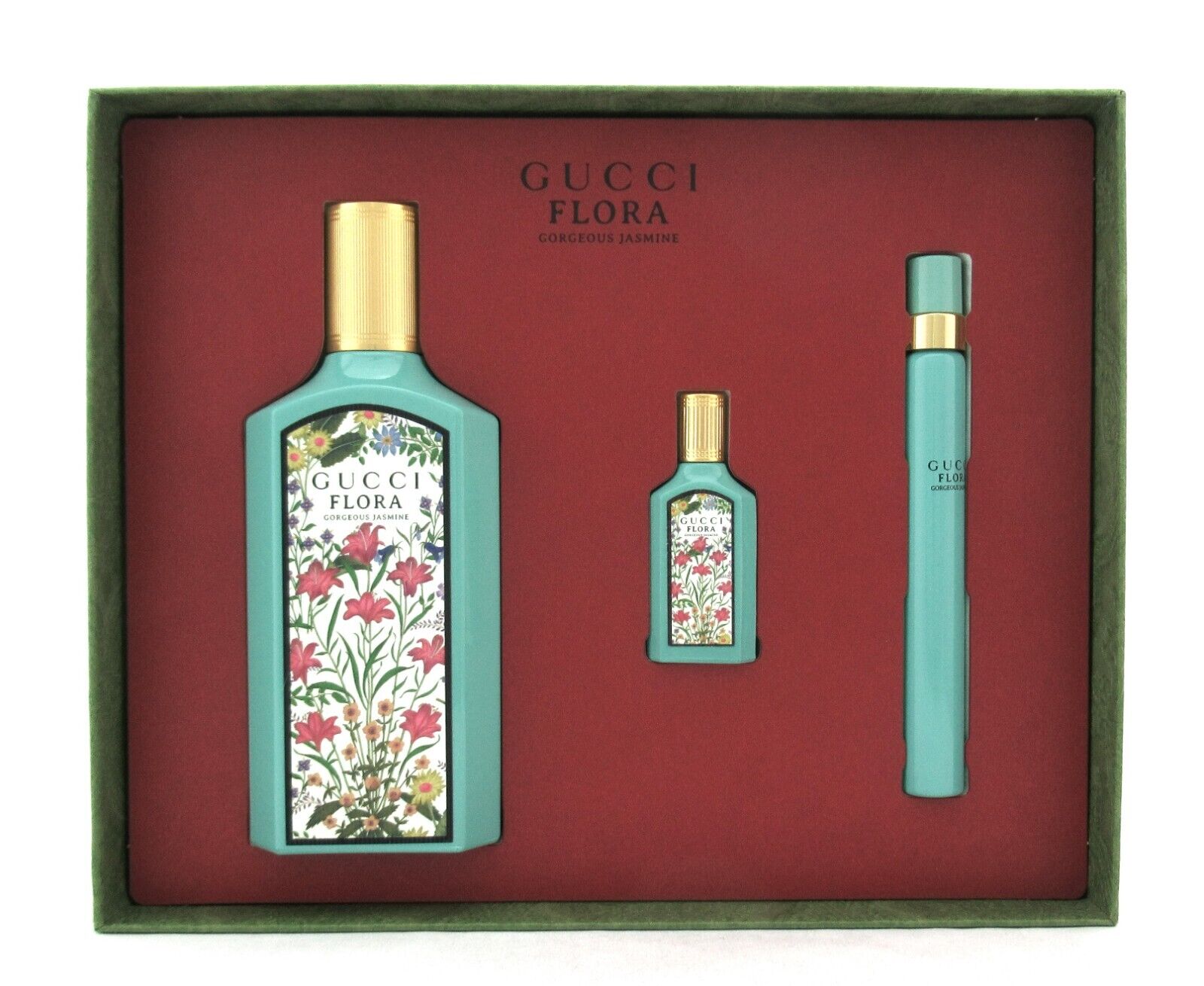 Gucci Flora Gorgeous Jasmine by Gucci Gift Set for Women Eau De Parfum Spray 100 ml./ 3.3 oz. + EDP Splash Mini 5 ml./ 0.16 oz. + EDP Travel Spray 10 ml./ 0.33 oz.Brand new. Comes in hard retail box as shown on the picture. Batch number may vary. (Our sku:3609)