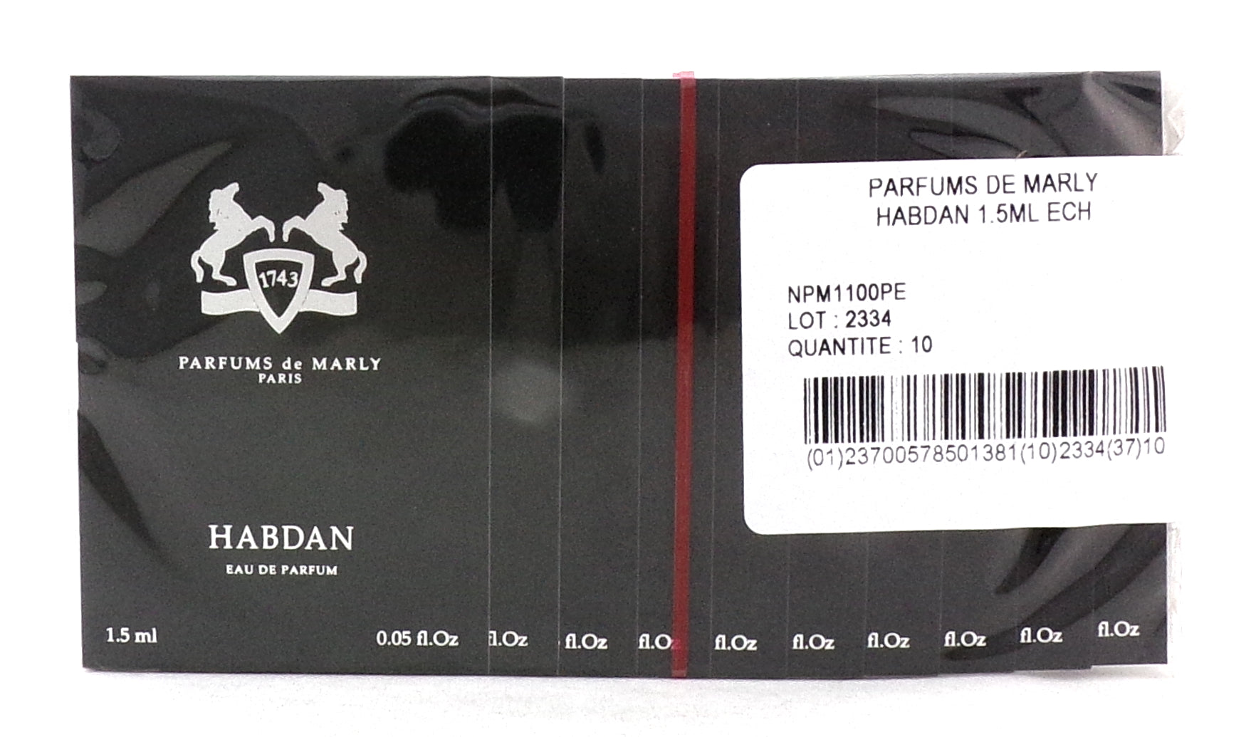 Habdan by Parfums de Marly 1.5 ml./ 0.05 oz. Eau de Parfum Vial Spray for Men. Pack of 10 pcs. New in Sealed Bag. Never used. May be marked "sample/not for sale."