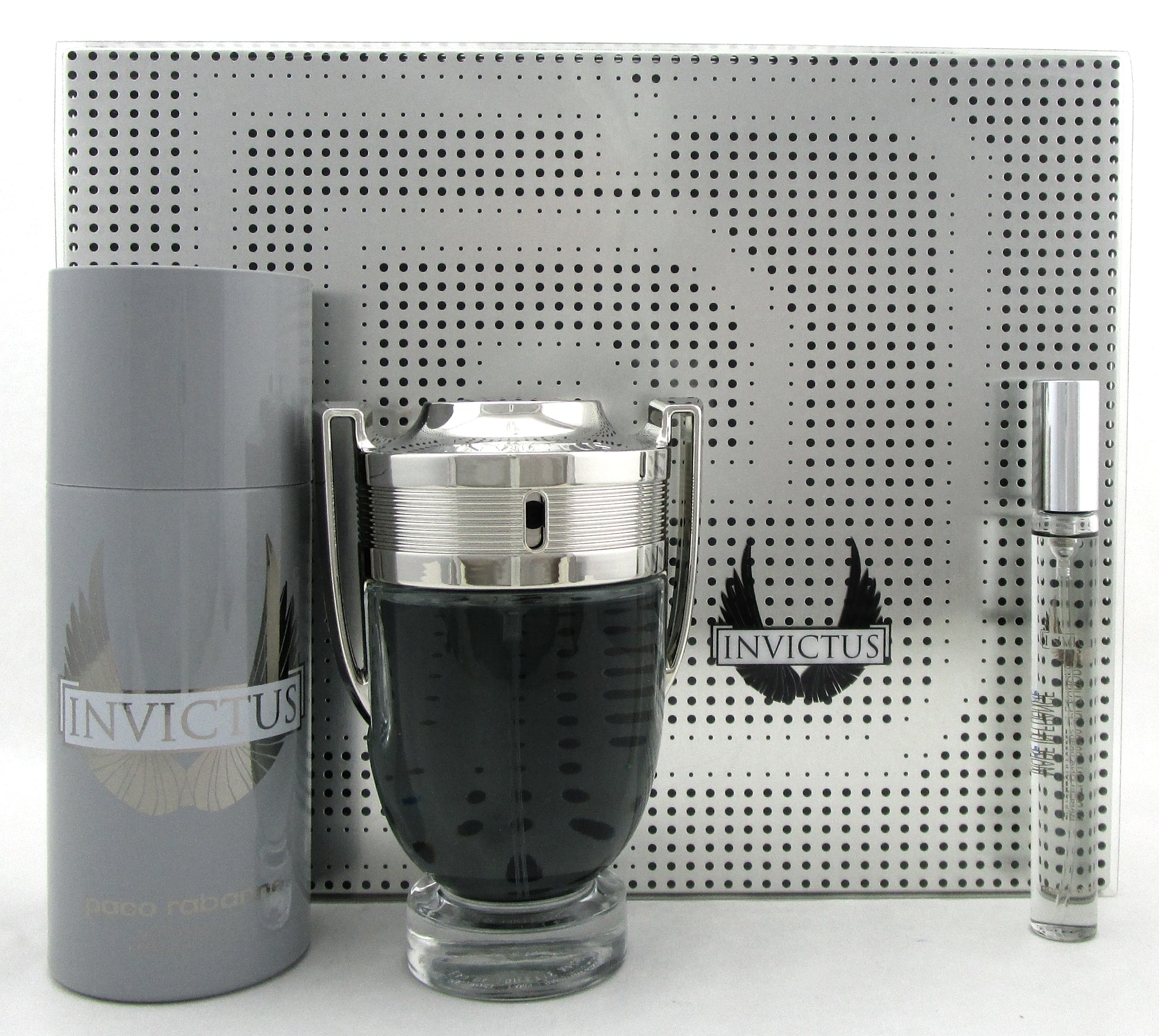 Invictus by Paco Rabanne 3 Pieces Gift Set for Men: 3.4 oz./ 100 ml. Eau de Toilette Spray + 0.34 oz./ 10 ml. Eau de Toilette Travel Spray + 5.1 oz./ 150 ml. Deodorant Spray. Brand new set. Comes in hard metal box as shown.