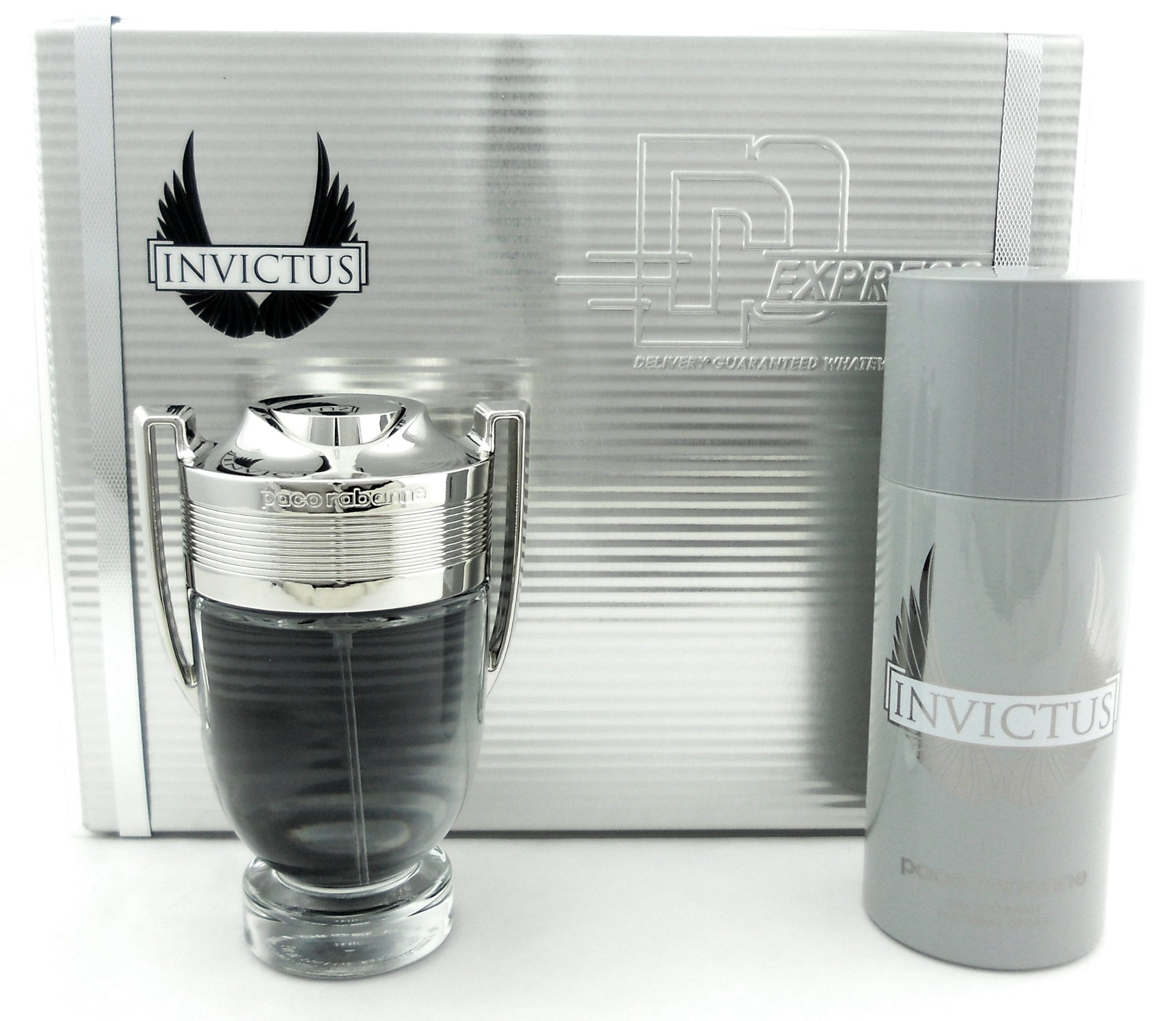Invictus by Paco Rabanne 2 Pieces Gift Set for Men: 3.4 oz./ 100 ml. Eau de Toilette Spray + 5.1 oz./ 150 ml.Deodorant Spray. Brand new in metal box.