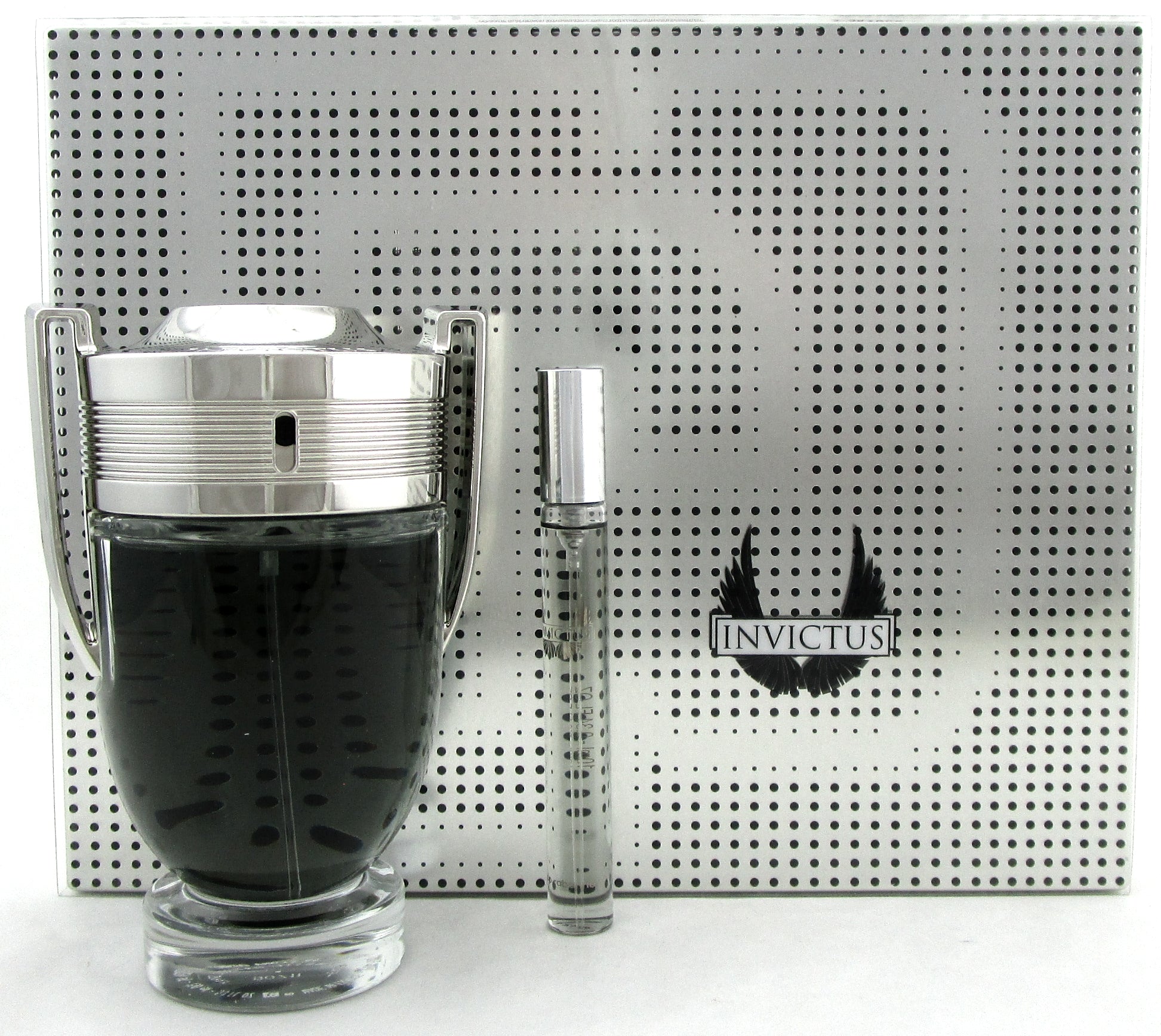 Invictus by Paco Rabanne 2 Pieces Gift Set for Men: 5.1 oz./ 150 ml. Eau de Toilette Spray + 0.34 oz./ 10 ml. Eau de Toilette Travel Spray. Brand new. Comes in Metal Box.