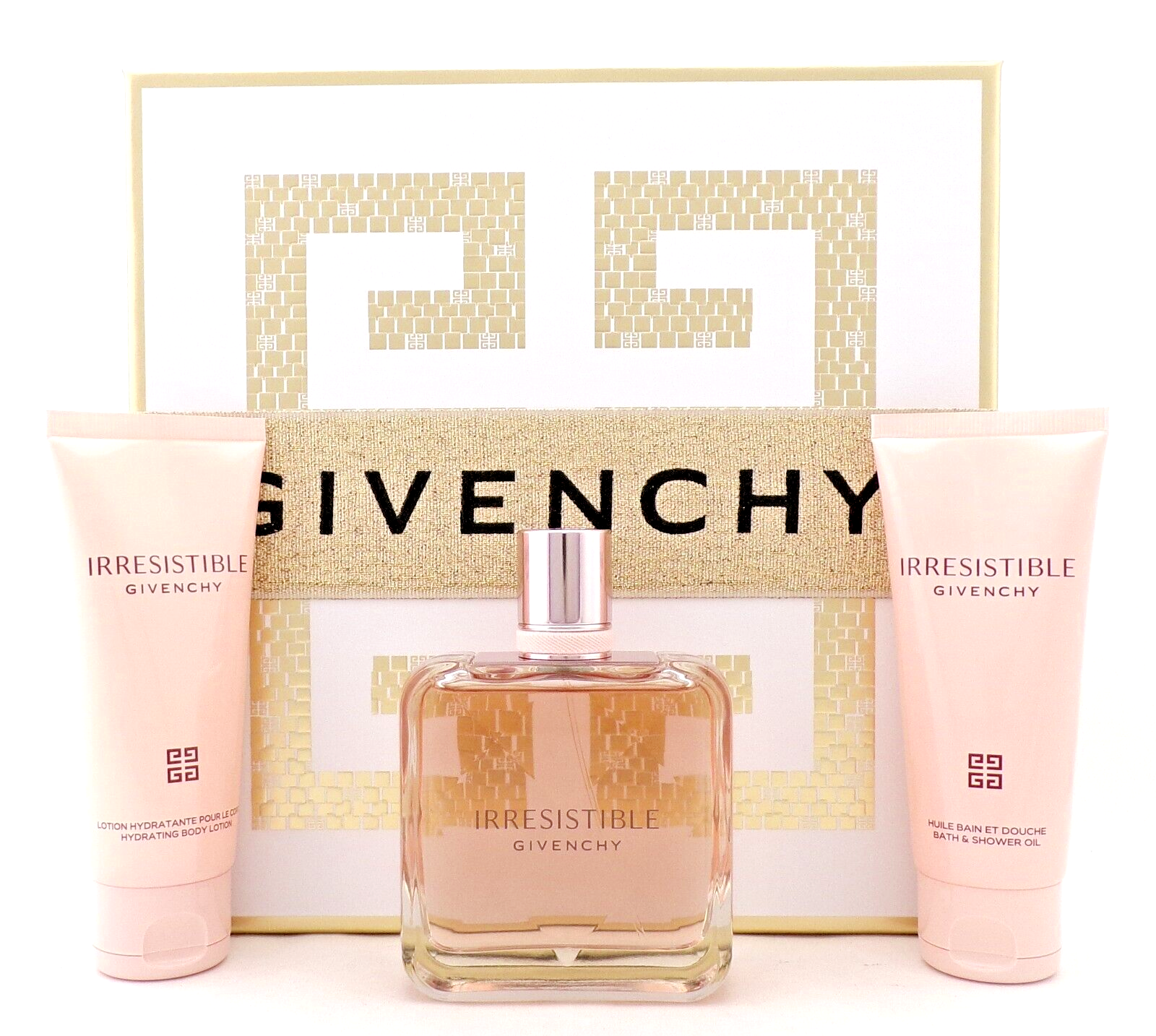Irresistible Givenchy by Givenchy 3 Pieces Gift Set for Women: 2.7 oz./ 80 ml. Eau de Parfum Spray + 2.5 oz./ 75 ml. Hydrating Body Lotion + 2.5 oz./ 75 ml. Bath & Shower Oil. Brand New Set. Comes in retail hard Box. (our sku:13978)
