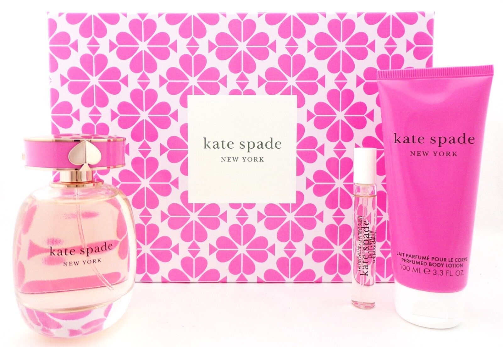 Kate Spade New York 3 pcs Gift Set for Women: Eau De Parfum Spray 100 ml./ 3.3 oz. + Eau De Parfum Spray 7.5 ml./ 0.25 oz. + Perfumed Body Lotion 100 ml./ 3.3 oz. NewBrand new. Comes in hard retail box as shown on the picture. Batch number may vary. (Our sku:13793)