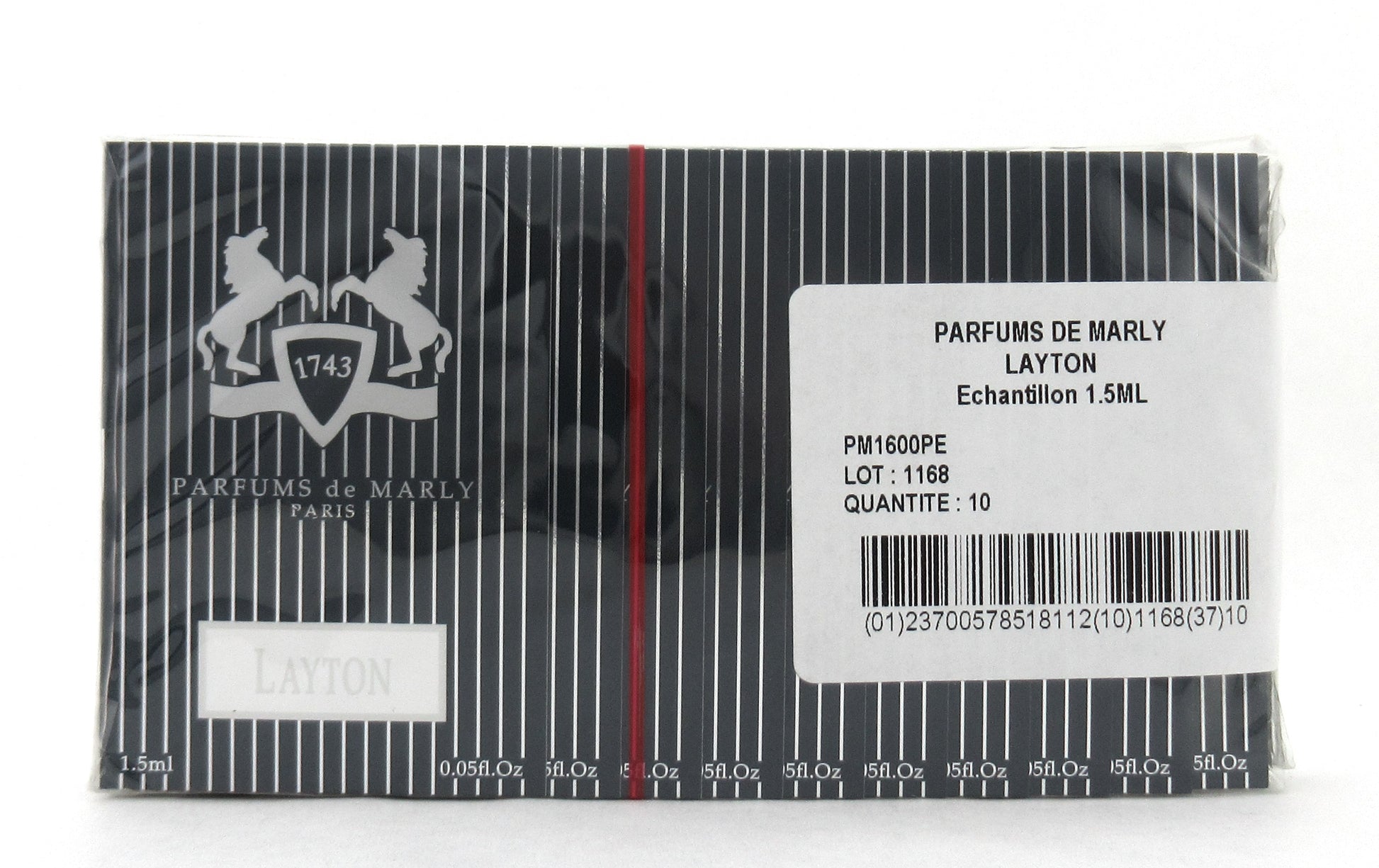 Layton by Parfums De Marly 1.5 ml./0.05 oz. EDP Vial Spray for Unisex. Pack of 10 pcs. New in Sealed Bag. Never used. May be marked "sample/not for sale."