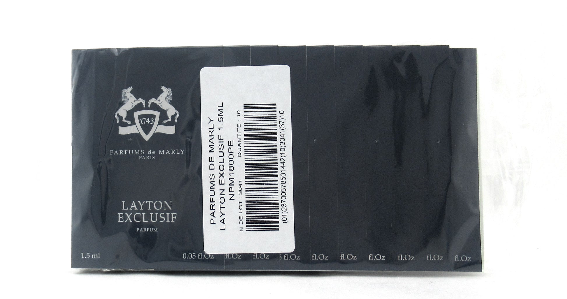 Layton Exclusif by Parfums De Marly 1.5 ml./ 0.05 oz EDP Vial Spray for Men. Pack of 10 pcs. Sealed Bag New. May be marked "sample/not for sale."